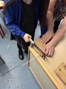 Children worked carefully to follow their designs and construct their vehicles. They used real tools—including saws with adult support—to cut axles, and used a range of joining techniques such as glue and tape This was a fantastic opportunity to develop fine‑motor skills and independence.