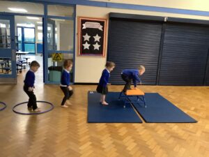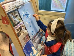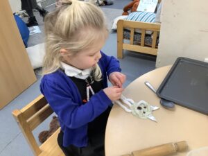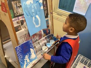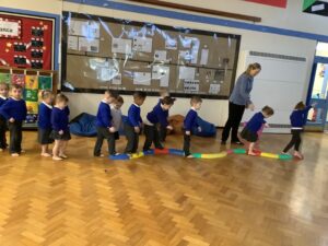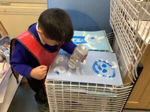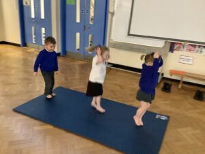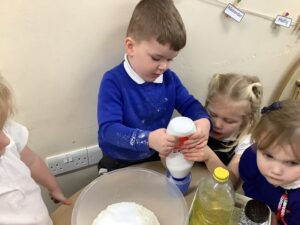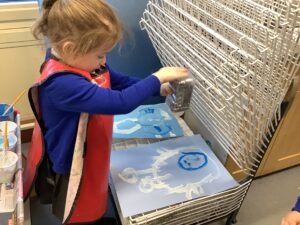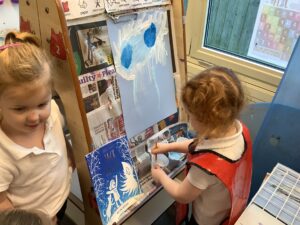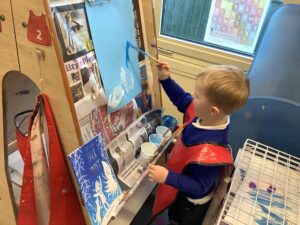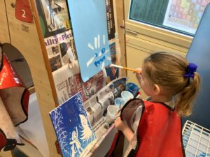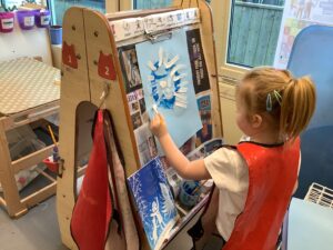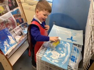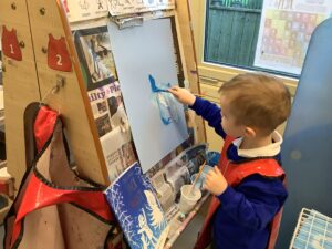 This week in Nursery, the children have been fully immersed in a magical world of winter! Our learning was inspired by the story Jack Frost, which led to wonderful discussions about the characters and the winter weather shown in the book. The children shared thoughtful observations about frosty mornings, icy patterns and the changes they notice during the winter season. Following this, the children contributed to a beautiful collaborative winter display. They painted characters from the story using soft shades of white and blue, developing their fine motor control as they used paintbrushes with increasing confidence. A subtle sprinkle of glitter gave each piece a sparkling, frosted effect, and the finished display truly showcases their creativity and growing confidence in expressing ideas through art. To extend our winter theme, the children made their own playdough, creating a snow‑ and ice‑like effect by leaving out food colouring and mixing in shimmering silver glitter. This provided a lovely sensory experience and opened up lots of opportunities for imaginative play. In the hall, the children enjoyed exploring winter-themed physical activities, using their imagination to travel through a snowy landscape. Hoops on the floor became icy puddles to step over or into, mats were used for safe snow hare jumps and balance beams represented snowy mountains and icy bridges. We also took part in a lively Squiggle While You Wiggle session to support gross motor development through movement and mark‑making actions.