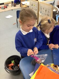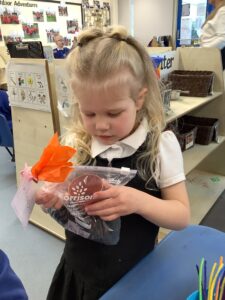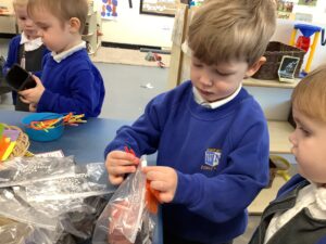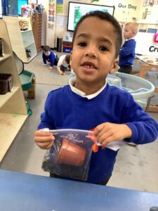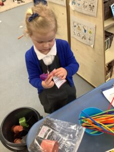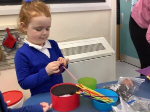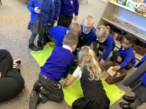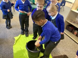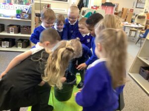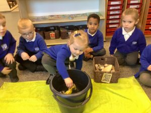 This week in Nursery we took part in Science Week by carrying out a fun water experiment. We began by half‑filling a bucket with water and inviting the children to notice the starting water level before placing a floating dinosaur into the bucket and observing how it sat on top of the water. The children were then given the challenge: “Can you get the dinosaur to the top of the bucket without touching it with your hands?” Using stones and pebbles, they explored adding them one at a time and quickly began noticing how the water level changed. We supported their thinking with questions such as “What do you notice happening to the water?”, “Is it going higher or lower?”, “How many stones do you think we’ll need?” and “What happens if you add a bigger one?” The children were fully engaged and excited as they watched the water rise and helped the dinosaur reach the top.