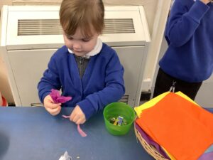 We completed the Mother’s Day gift that we started last week and are very excited to give them to our families! In maths, we explored grouping by separating toys into parts and counting to understand that whether items are together or split into different groups, the total amount stays the same. For phonological awareness, the children focused on rhyming words, using picture cards to find and match rhyming pairs while listening carefully for words that “sound the same at the end.” During our outdoor session on Friday we explored our school grounds looking for signs of Spring. We discovered lots of new growth on tress and bushes as well as beautiful daffodils, hyacinths and primulas.