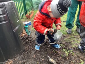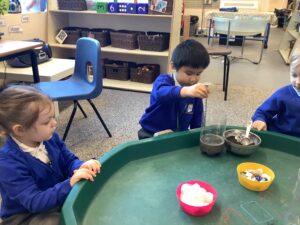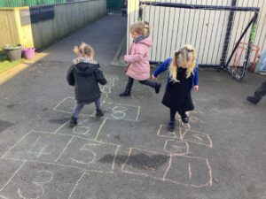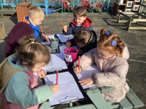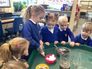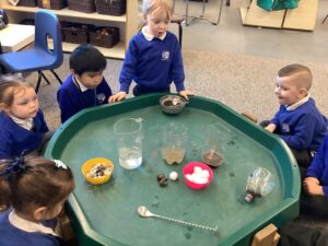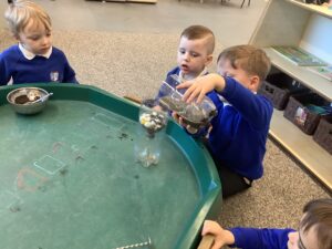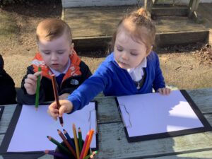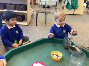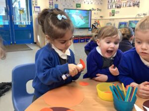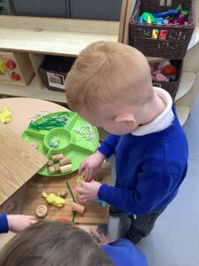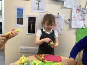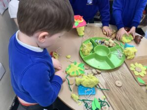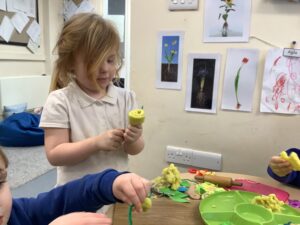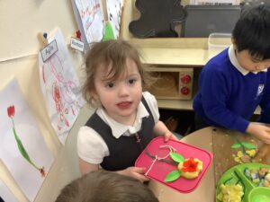 We then began our new Spring topic, and the children have enjoyed a range of seasonal activities. We made bright yellow spring playdough and used string, corks and green pipe cleaners to create spring flowers, thinking carefully about the different parts of a plant such as roots, bulbs, stalks, leaves and petals. The children also started making a special Mother’s Day gift, and we’ll be able to share more about that next week.