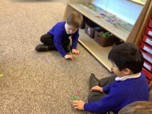 In maths, we played our Mystery Change game to practise making five, adding, taking away and representing numbers with counters. On the interactive whiteboard the children enjoyed a dinosaur ordering game to build their understanding of number order.