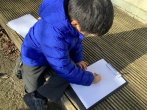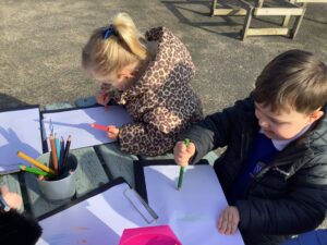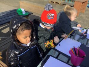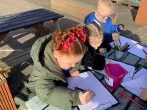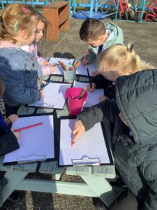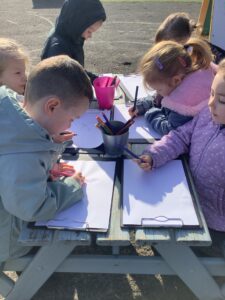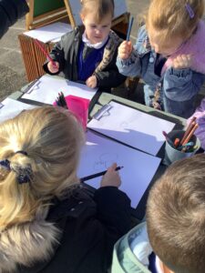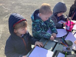 We also went on a Spring listening walk to develop phonological awareness, using our ears to hear signs of spring such as birds chirping and leaves rustling. We used clipboards and paper outside to draw what we heard.