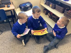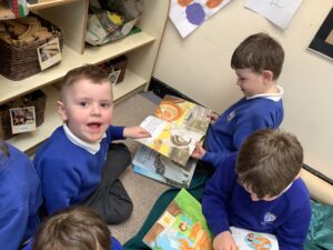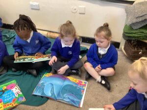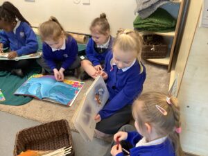 On Thursday we celebrated World Book Day. The children took part by making their own Gruffalo masks, and we displayed some of these proudly on our nursery door. We enjoyed reading The Gruffalo together, and some of our Key Stage 1 pupils joined us to share stories on cosy blankets, which the children absolutely loved.