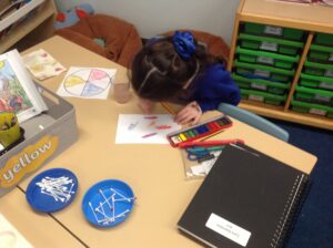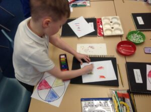 First, the children created their own colour wheels, experimenting with mixing primary colours to make secondary ones. They then explored warm and cool colours, as well as how to make colours lighter and darker using tone.