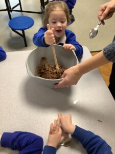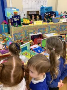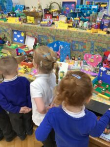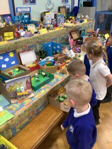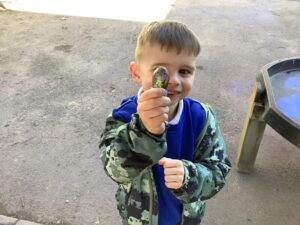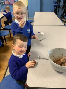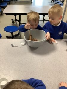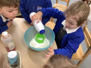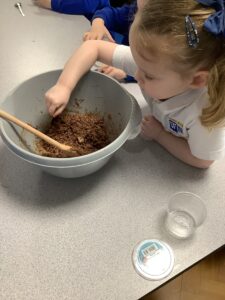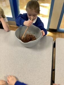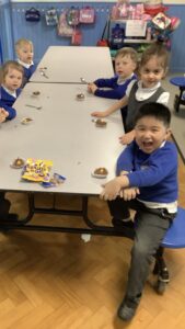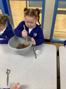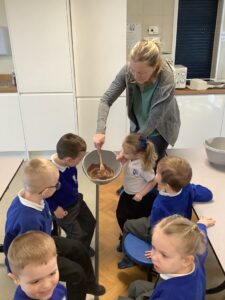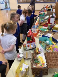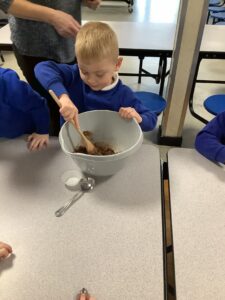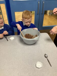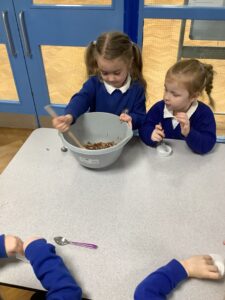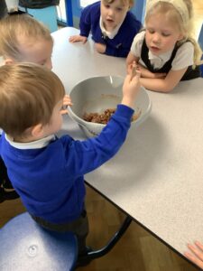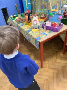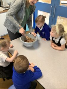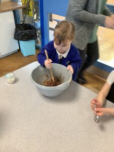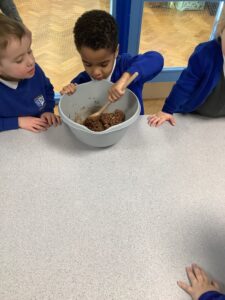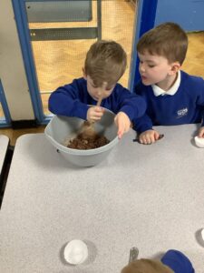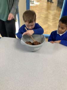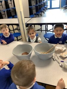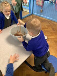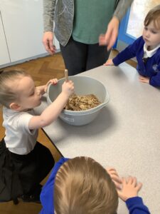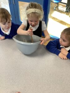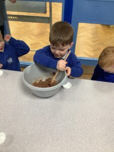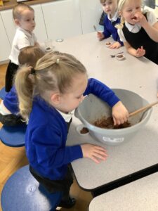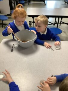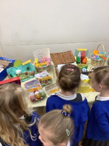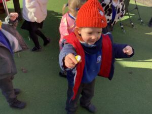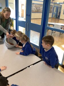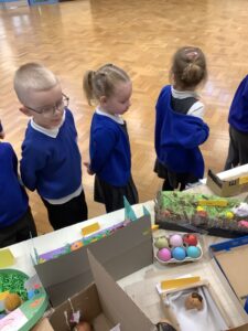 This week in Nursery, we focused on Easter and explored the Easter story together. Our playdough area had a special Easter and new‑life theme, complete with Easter chicks and spring decorations to spark imaginative play. We finished our Easter cards by writing names on the inserts of the cards we began last week, and we had great fun making chocolate nests using shredded wheat and melted chocolate—this led to some lovely science learning as we observed chocolate changing from solid to liquid, and then back to solid again once set. During our physical development and music session, we listened to classical pieces such as Morning Mood by Edvard Grieg, The Swan by Saint‑Saëns, and Debussy’s Arabesque. The children moved their bodies in response to the tempo and mood of each piece, imagining themselves as spring animals like bunnies and chicks. We also visited the school hall to view all of the wonderful paste‑egg competition entries from across the whole school—there was lots of excitement as the children spotted their favourites and admired the creativity on display! On Friday, we had a very exciting outdoor session—the Easter Bunny had visited our nursery garden! The children were thrilled to discover chocolates hidden among the plants and playground equipment! Some of us re-potted the lupin seedlings and spinach plants that we plated in the Winter which have outgrown their pots.