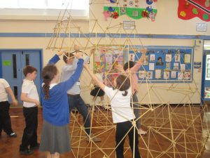 Today the Elms, Oaks and Beeches had an excellent session with Wilmont Dixon turning canes and elastic bands into mini tetrahedrons. We then connected all the mini tetrahedrons together and created a tremendous tetrahedron, which towered over everyone.