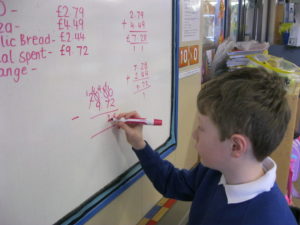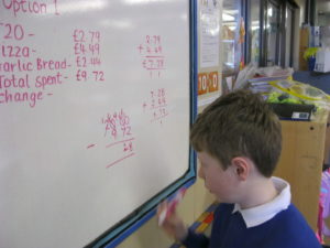 This morning in Tulips we have been using our money knowledge to calculate prices at the Windy Nook Cafe. We have added amounts of money together to find our total spend. Then we had to use subtraction to find our change from £20. We have enjoyed using our knowledge of adding and subtracting decimals in a real life situation!