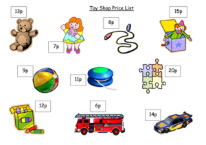 Play shops- use real coins to shop for food/ toys. Add price tags. Children can learn about the value of coins, adding and giving change. Start with items up to 10p and then increase as they become more confident.