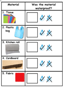 Discuss with your child what material/s are best to use to keep you dry and why.