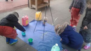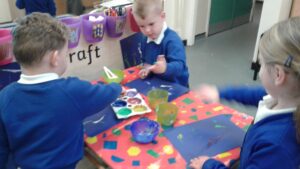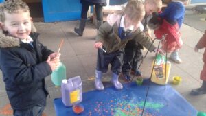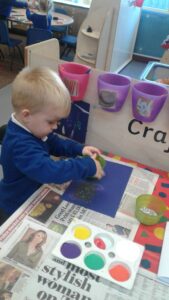 Our focus this week has been fireworks and as always, we have produced some fantastic artwork. We made individual paintings of fireworks by using our fingers instead of brushes and we made joint pictures which we produced outside using a tripod, and paint. We also listened to the story, Hovis the Hedgehog and talked about fire safety.