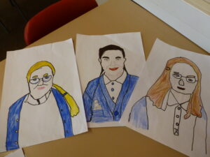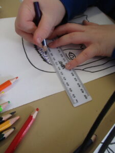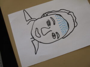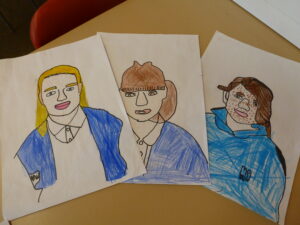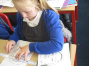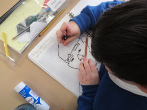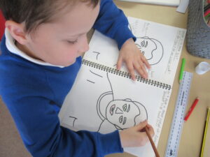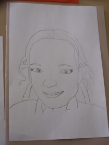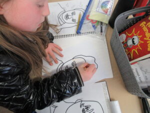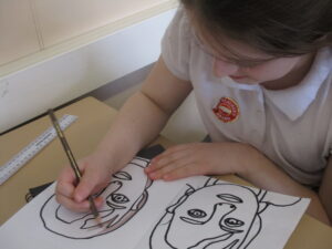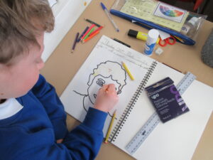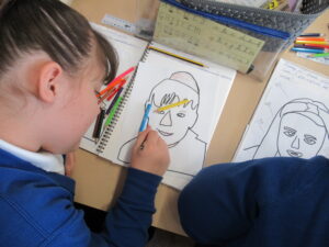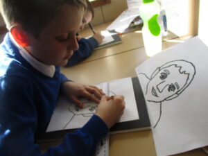 After they had traced their face, the children added Pop-Art features such as Ben Day dots and block colours. Speech bubbles and other Pop-Art-inspired additions will come next week.