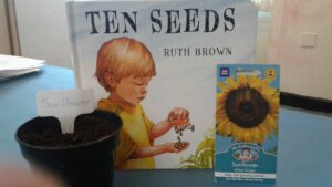 This week, we have focused on the book, Ten Little Seeds by Ruth Brown which is about ten sunflower seeds and what happens to them. We planted some sunflower seeds which we are hoping to re-pot outdoors when they have grown into seedlings. Keeping the sunflower theme, the children made a pack containing a sunflower growing kit for their mam/special person for Mother’s Day and also a beautiful card featuring some flowers which were created using a hand print and finger prints.