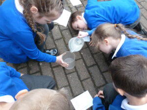 They carefully measured different amounts of water into a bottle. Tapping the bottle and listening for changes in pitch had to be done so that we could decide whether the amount of air in the bottle was affecting the length of the sound waves.