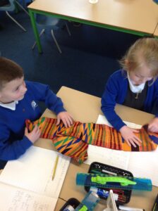 Owls have been researching more information about Ghana. This weeks geography lesson saw them compare clothes between Ghana and Windy Nook. Remembering that Ghana only have two seasons the children found out that they don’t need warm clothing such as jumpers, snow boots or suits, woolly hats and scarfs and gloves but they do need lots of suntan lotion, flip flops, shorts and t-shirts. They were beautiful bright traditional dashiki which are tunics with kente patterns on. The children compared their school uniform to traditional dashikis. The children were lucky enough to have the opportunity to look at different kente patterns from Ghana.