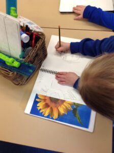 During their basic skills lesson Owls enjoyed a sketching lesson. They looked at sketching their head and face. First they talked about the different features on their face such as shapes and lines. Then they used a cross line effect to help them centralise their features of eyes and nose. They used a pencil softly and slowly to support their sketching.