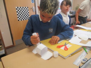 Last week, Bluebells were working on shape in maths. They looked at the difference between 2d and 3d shapes and identified their features: faces, edges, vertices and angles. On Friday, children used nets to build a range of different 3d shapes; it was a tricky job but it allowed the children to see how nets come together to make them.