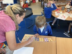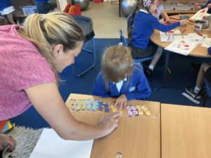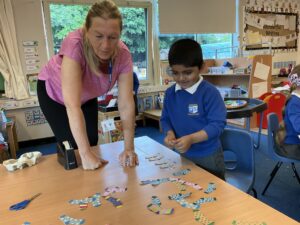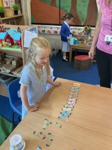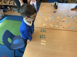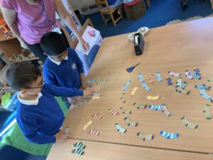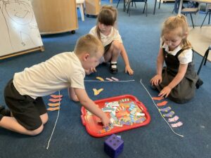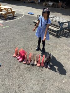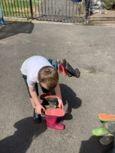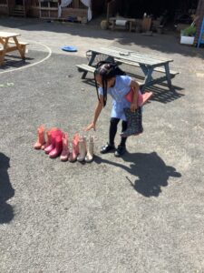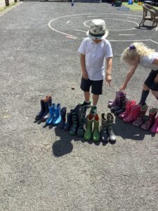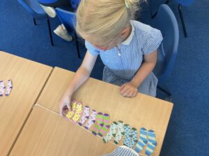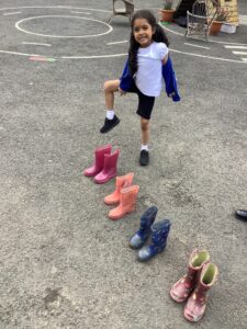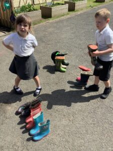 This week, Reception children have been learning how to count in 2’s, and thinking of reasons why we would need to count in 2’s. We looked at pairing socks and wellies together and worked out how many pairs before counting how many individual. The children became confident very quickly at understanding the concept of a pair and were able to count accurately to find out the total number of socks or wellies.