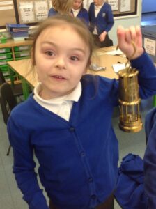 To support our learning for this half terms topic Trains, Planes and Automobiles the children were able to investigate a Box of Delights from the Discovery Museum. Inside the box were a variety of artefacts linked to George and Robert Stephenson. The children could hold a replica steam train, a Geordie lamp, coal, a pocket watch, look a different maps, photographs of George’s house in Wylam, different coal mines and a £5 note. Lots of questions were asked as the children were very inquisitive.