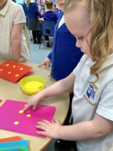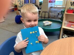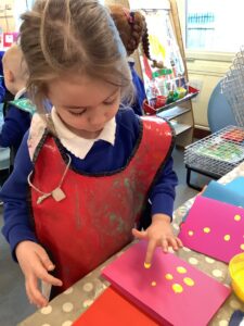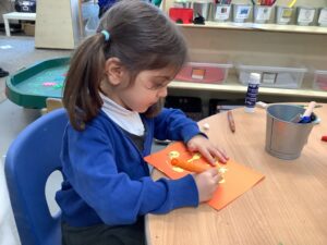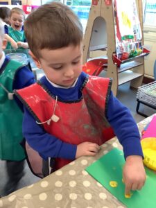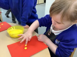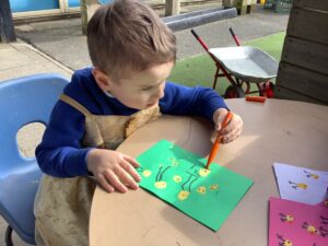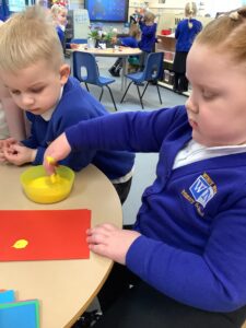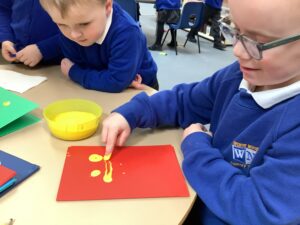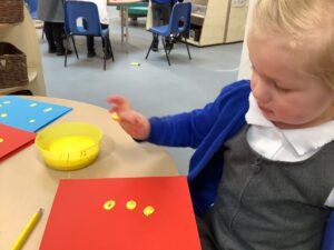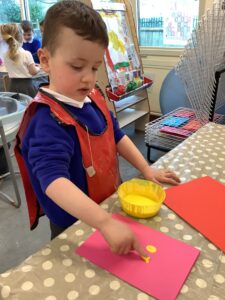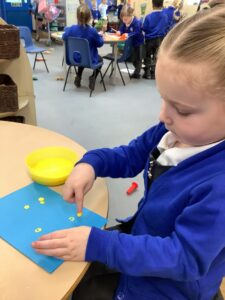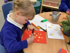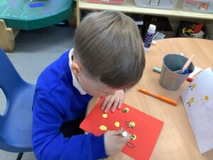 The children also began making their Easter cards. They selected their own card colour and demonstrated confident DT skills by folding the card independently. They made yellow fingerprints to represent Easter chicks and new spring growth, and once these had dried, they carefully added eyes, a beak, and legs to complete their designs.