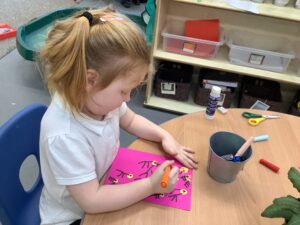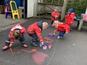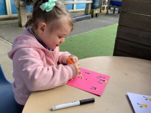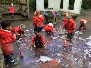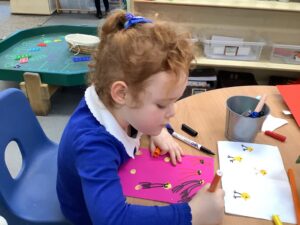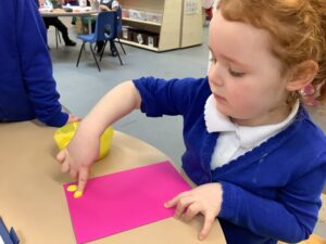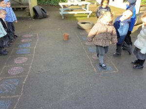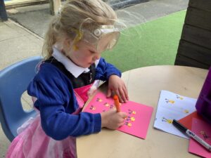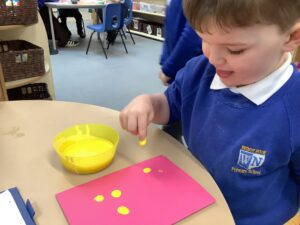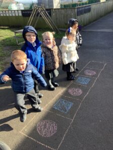 This week in nursery the children enjoyed a range of spring‑themed learning experiences. In maths they explored and developed early movement pattern understanding through gross motor actions, body awareness, and spatial reasoning. They created simple repeating patterns using actions, and outdoors they loved playing pattern hopscotch, using colours instead of numbers to recognise and continue patterns in a playful, active way.