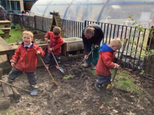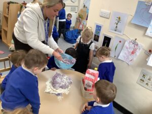 At the playdough table we talked about new life and spring changes. The children made playdough eggs and practised placing them into ten frames, combining imaginative play with early maths concepts such as counting, matching, and spatial awareness.