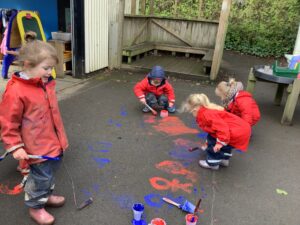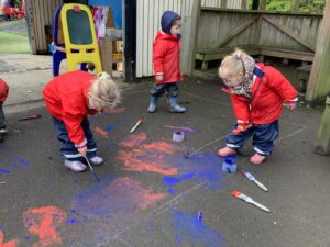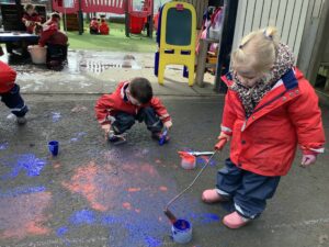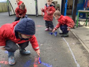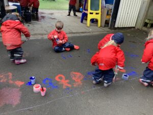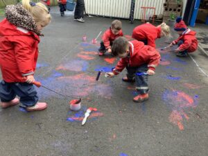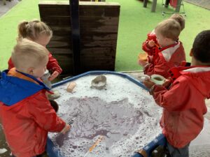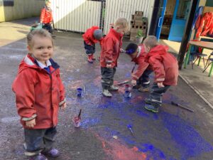For Golden Time on Friday we watched The Smeds and the Smoos and experimented with paint during our outdoor session. We mixed blue and red to make different shades of purple.