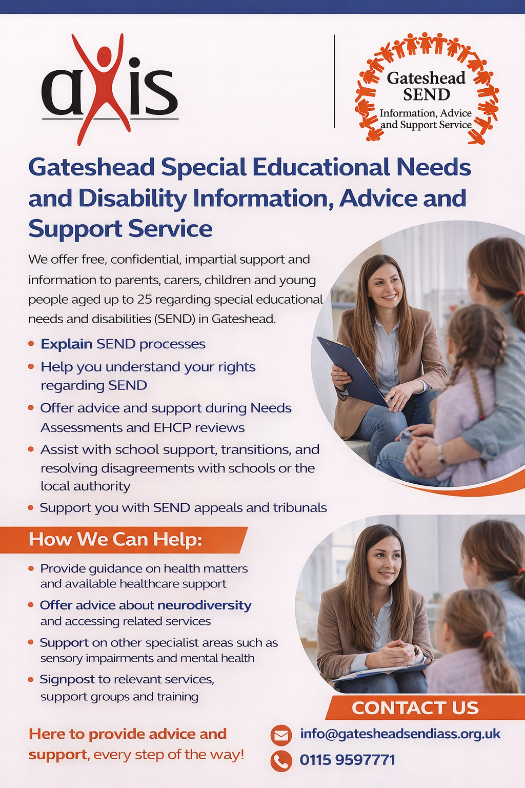 We understand that a change in provider can feel unsettling for parents and carers. However, Axis has extensive experience in delivering SENDIASS services and is fully committed to supporting families in Gateshead.